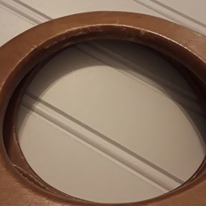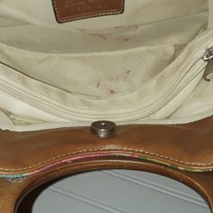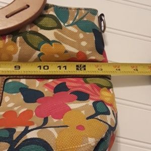 GUC Fabric material with floral print with wooden handles no shoulder strap included. Purse has 3 compartments makeup sprinkles noted in one compartment. Can be removed with a makeup remover wipe.