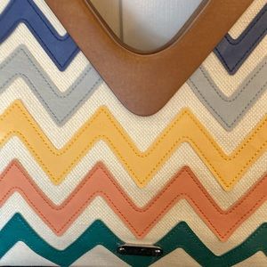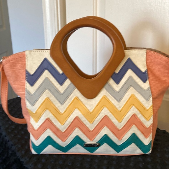 Relic Handbag/Crossbody bag in a colorful canvas type fabric. The bag had one outside zippered pocket a zippered divider as well as 3 pockets on the inside.