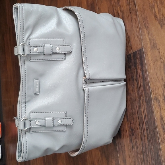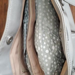 a neutral grey purse that would go great with Amy outfit! divided interior with center zippered pocket, back zippered pocket and 2 open pockets. 1 zippered pocket and 2 open pockets in the exterior. excellent condition.