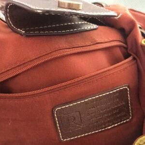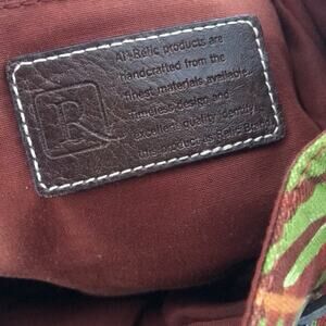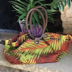 Relic Leaf Print Cinched Snap Closure Green Red Handbag with Removable Strap. Inner zipped pocket. Approximately 15 x 8.5 x 5 on sides, 5 inches on bottom