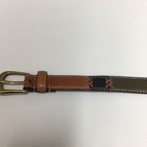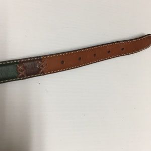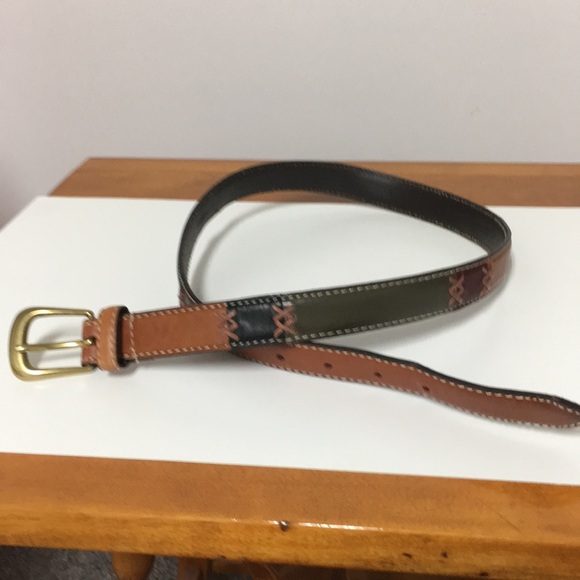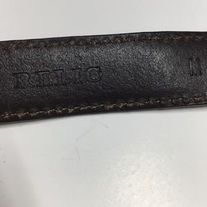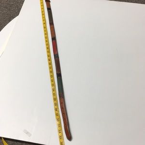 Relic Leather Belt is great to wear with jeans. It measures 36” total and at first hole it fits a 32” waist and last hole fits a 28” waist. It has a mix of colors (camel, green, brown, red and olive). Looks like new in excellent condition.