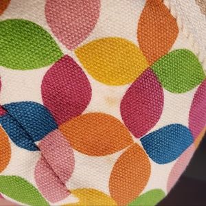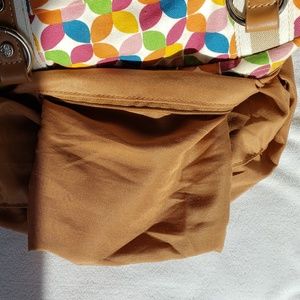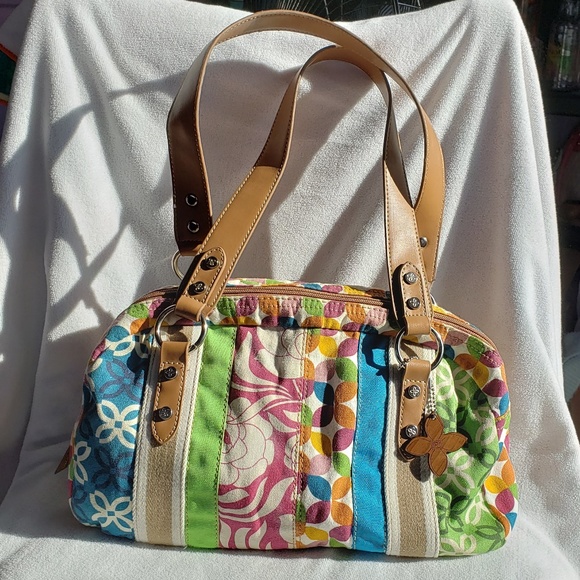 Relic purse has blue, green, pink, yellow, orange, brown, and cream colors throughout. no holes all zippers work great, does have some spots inside and outside, has signs of wear throughout still has a lot of life in it. Approximate measurements are: drop 9 inches, length 11 inches and depth 6 inches, and width 5 inches.