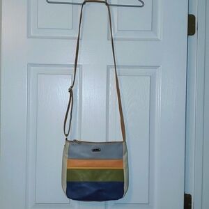 This is a great crossbody bag in neutral base colors with beautiful greens and blues to add pops of color. The crossbody strap is adjustable with a generous strap drop that will work for many heights.