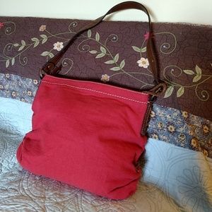 Red durable fabric exterior with a brown leather like strap and Embellishments. The interior is opened with a zipper and has a leather like strapped open. Inside is a compartment that zips up a case for a cell phone or glasses and very large to put things inside. You have a side pouch that zips with a leather like strap to help open it. Would look great for fall fashion with jeans.