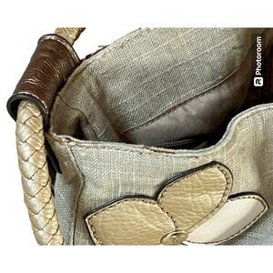 Relic Purse Beige Canvas Brown Ivory Gold Metallic Tea Rose Appliqué Double Braided Rope Shoulder Strap Hobo Handbag