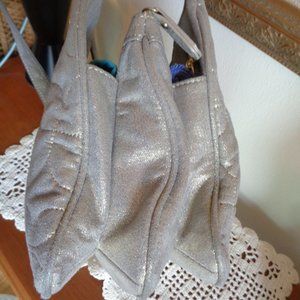 Bag has a sparkle shimmer and is super soft to touch. Bag is quilted with flowers and has 3 sections. The two outside sections are open and the middle one that divides them has a zipper closure. Also in the middle section is a back wall zip pocket and one slip pocket.