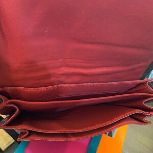 Beautiful red paisley leather purse has multiple compartments inside and out.