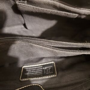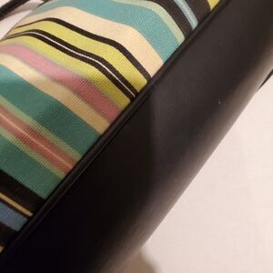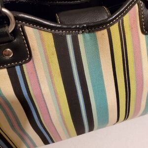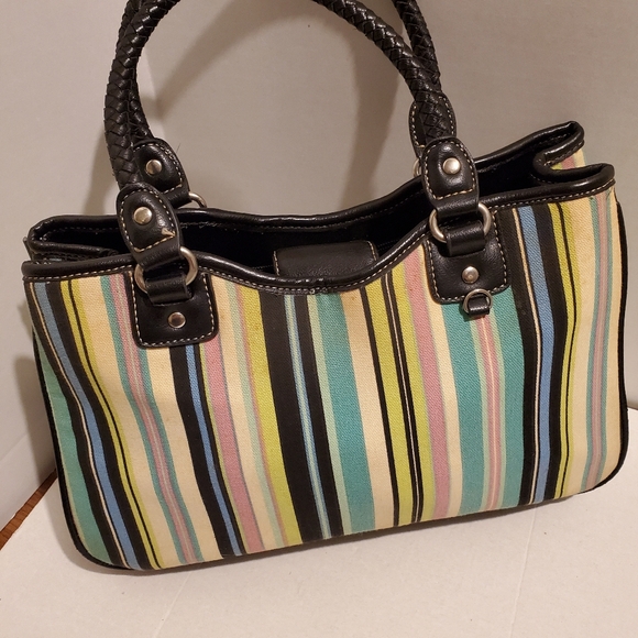 Relic multi colored handbag with black trim.It has roped straps ,2 pouches,zippered pocket and 2 separate sections with middle zippered.It measures 8" high,12 wide and straps are 7".