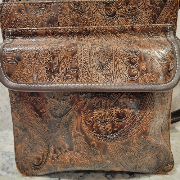 Elegant tan leather bag with detailed paisley embossing. Ideal for daily wear.