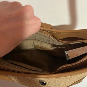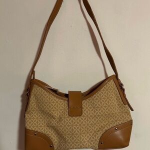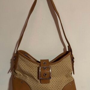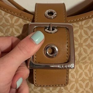 Stylish Relic shoulder bag. Features a tan patterned body with brown accents. Secure buckle closure. Perfect for everyday use.
