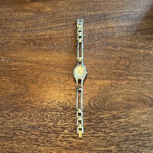 Stylish Relic watch featuring gold and silver tones. Includes a vibrant red box and warranty booklet.