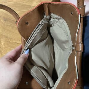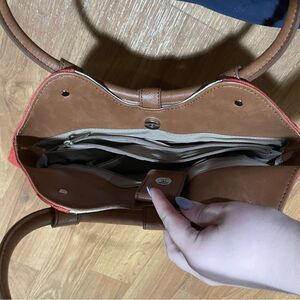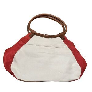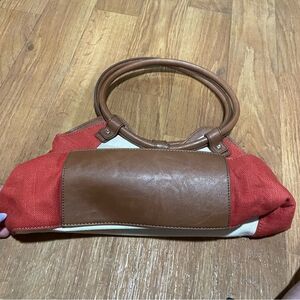Gently used relic red and cream colored with faux leather circle handles purse. Butterfly print, button closure with inner zipper pockets. Please review all photos for any/all signs of wear. Comes from a smoke free home, bundle with other items to save and minimize shipping cost.