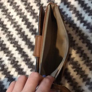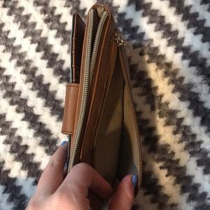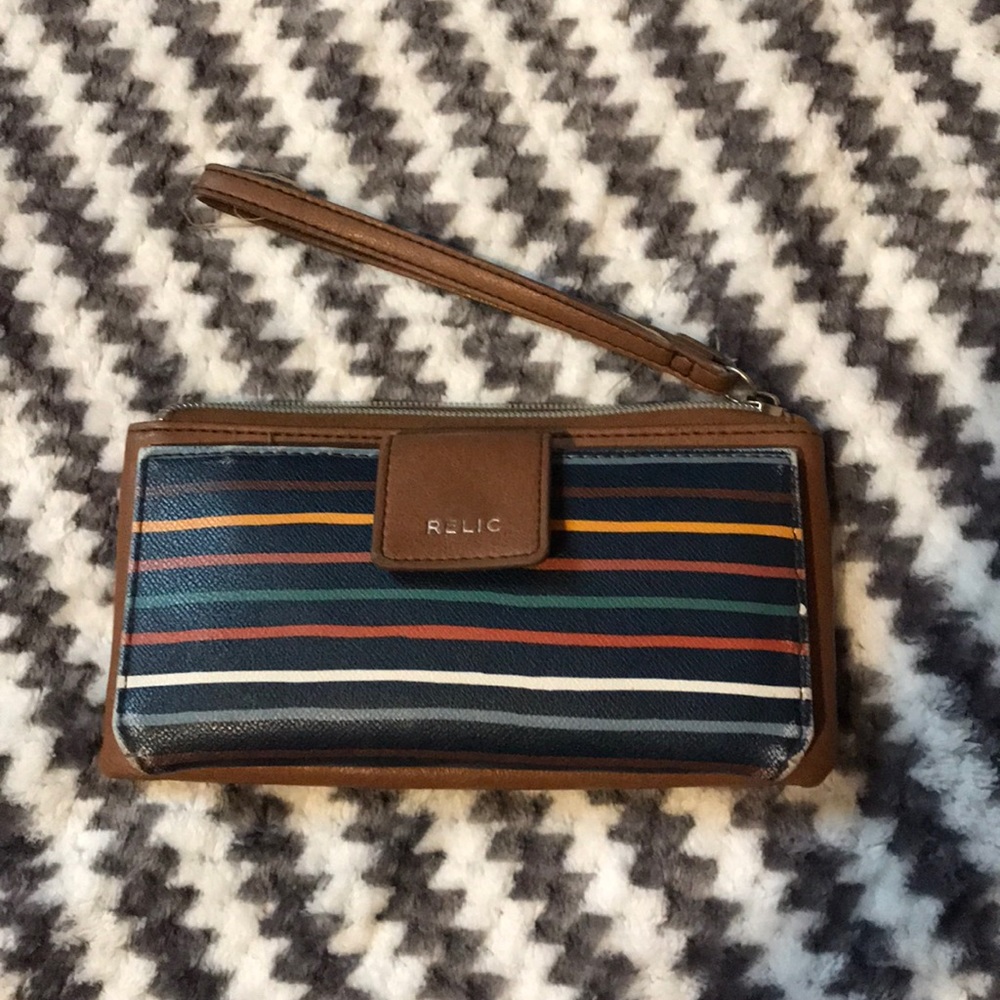 leather brown w/ navy blue, mustard yellow, green, or range, and brown stripes on front w/ 11 slots, money holder, change hiker, and extra pocket