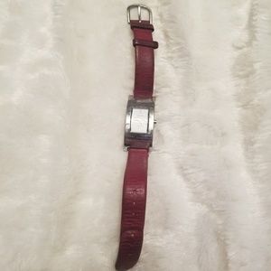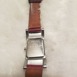Relic watch made by Fossil, with a unique shape. The face is Pearl with a Red Leather Band. This Watch is Used with Minor Scratches from Normal Wear. Still has alot of Life Left. Please give this Lovely Watch a Good Home! Used but still Good Condition!