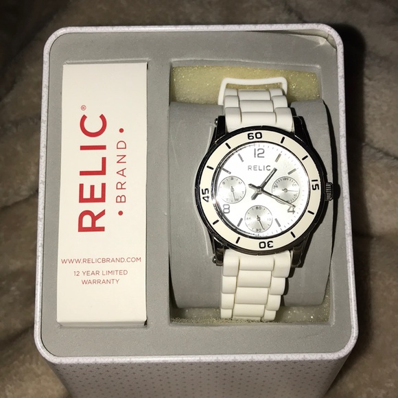 Relic watch with white band. Barely used. Needs battery. Comes with Relic box.
