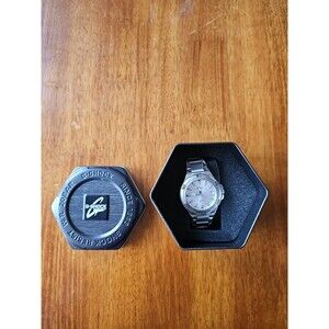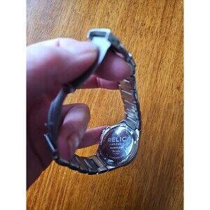 This Relic men's wristwatch is a stylish and casual timepiece designed with a silver stainless steel band and fold-over push-button deployant closure. The watch features a 40mm round case with a silver sunburst dial pattern and easy-read date display. It is equipped with a quartz battery movement and is water-resistant up to 50 meters (5 ATM). It works but needs a battery.