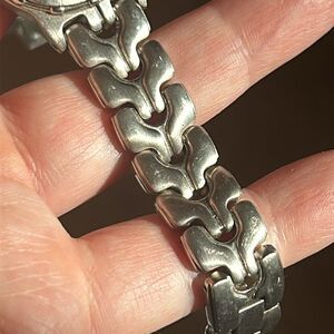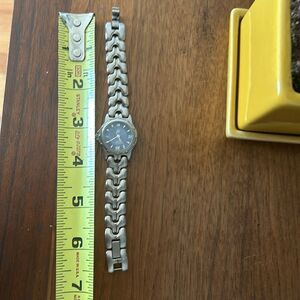 Beautiful watch from relic. Silver colored metal with blue face. This watch needs a new battery.