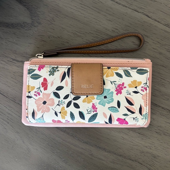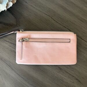 2 zippers and built in wallet. Small stain bottom right corner, otherwise in great condition. 7.5”x4”