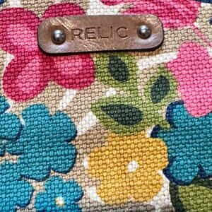 Relic by Fossil Crossbody Purse Brown Pink Blue Floral Canvas Slim Zip Top Boho