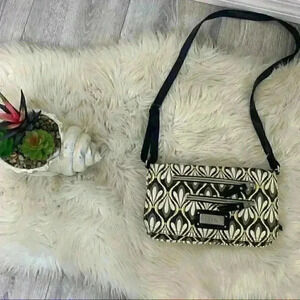 New without tags. In black/white/yellow. Faux-leather trim offers a contrast to the canvas construction. Magnetic snap closure. Adjustable crossbody shoulder strap. Exterior has three zippered pockets. Interior has zip pocket & slip pocket for your phone. Canvas/faux leather. Wallet and purse all in one.
