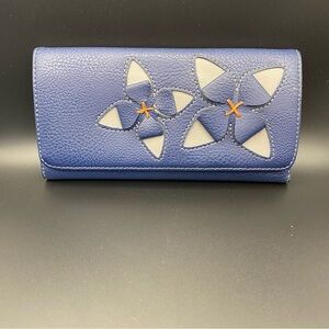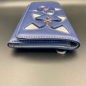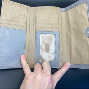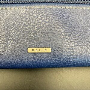 This trifold wallet by relic, which is made by fossil, is adorned in this navy blue pebble leather. Does not have any scratches anywhere and the corners around the edges look great. Has lots of credit cards slots and an ID pocket. It has an ink mark on the inside, but the remainder of the wallet is in great condition. Measurements are approximate.