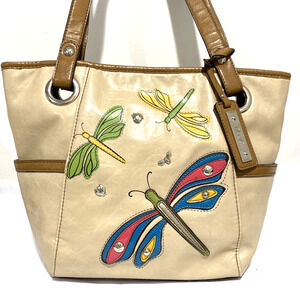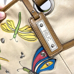 Relic shoulderbag whimsical purse with mod butterlfly appliques and silvertone studs on the faux leather exterior front. Super cute Boho style with bag charm - fabric lined interior with plenty of pockets - magnetic snap closure. In excellent condition - gently used - no flaws.