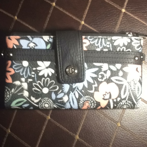 Relic wallet front slip pocket inside license spot, card slips zipper coin pocket. Black light blue and peach floral design.