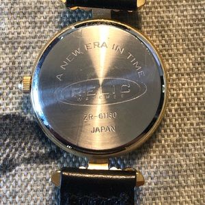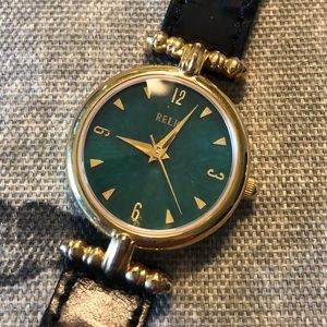Relic green and gold watch with faceted crystal on braided leather band, excellent condition, a really fun design.