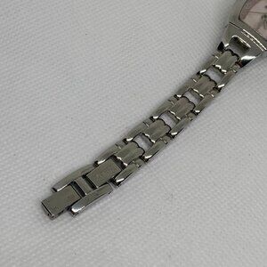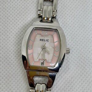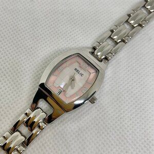 Relic women date silver tone watch pink dial 21mm all stainless steel analog quartz adjustable links bracelet size up to 7.5” , in good condition battery installed