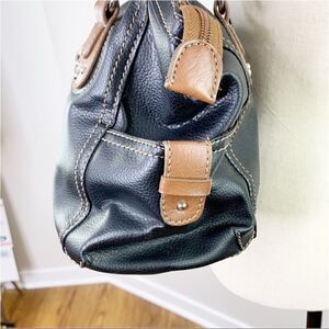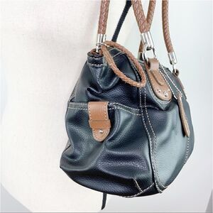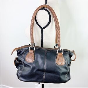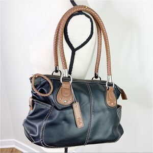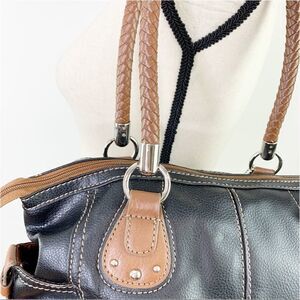 Relic Vegan Black and Brown Leather Satchel w/Braided Handles EUC This bag is a great size with multiple pockets and sections to keep you organized. The main bag is black faux pebbled leather with rich brown accents. Silver tone hardware pulls it all together. Barely used condition as shown. Please see photos for additional details.