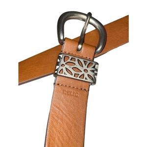The Relic by Fossil Floral Perforated Keeper Belt is a stylish marvel in excellent condition. A unique combination of contemporary design and traditional craftsmanship, this beautiful belt has been expertly crafted from vegan leather. The eye-catching floral perforations in a rich saddle brown color makes it a standout piece for any wardrobe. Moreover, the belt's nickel-toned hardware adds to its elegance. Versatile and stylish, you can dress it up or down according to your style needs. Get ready to elevate your fashion game with this timeless accessory!