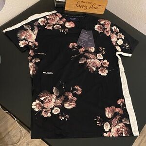 Stylish black t-shirt with floral design and white accents. Perfect for casual wear. This is a super nice and well made shirt and I can tell it’s gonna fit someone perfect. It’s definitely a snug slim fit I would say. The chest is around 19.5-20” and it’s a men’s medium new with tags never worn.