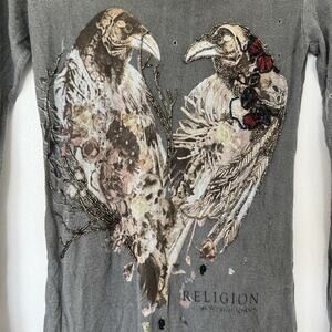 Religion London Goth Grunge Distressed Longline Tunic Top XS Graphic Bird Heart
