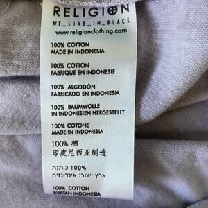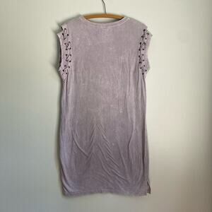 Religion We Live in Black Sleeveless T Shirt Dress size Small, subtle Tie-Dye with pastel lavender / grey color. Lace up sleeve detail, side slits at bottom of dress. Tag states: 100% cotton / made in Indonesia / size S / 10 / 38 .