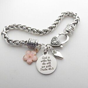 Features: Elegant cable chain bracelet featuring Psalm 46:5, 'God is within her, she will not fall.' The lobster clasp makes for easy wear, perfect as a motivational gift. A meaningful piece to carry daily encouragement.