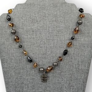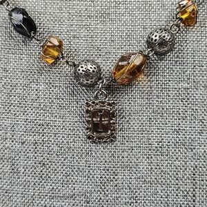 Dark gray link chain with wire wrapped amber and black glass beads, silver tone accents, and a dark gray cross pendant