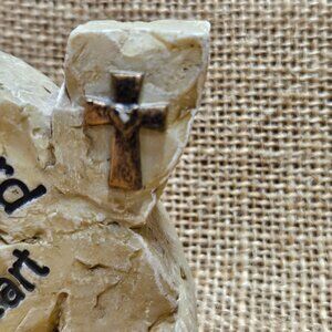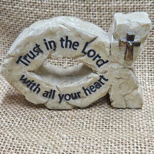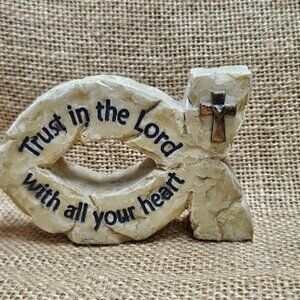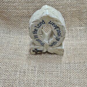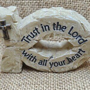 This stone figurine reads Trust in the Lord with all your heart. It measures 3.5 inches long and is 2 inches wide. It weighs 6 oz and is made of stone. This would make a sweet gift.