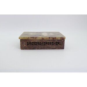 Hand-carved stone trinket box with a polished finish and brass cross inlay on the lid. Rectangular shape with a lift-off top. Likely handcrafted in India. No chips or cracks.
