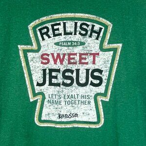 This unique, green graphic t-shirt features a bold "Relish Sweet Jesus" design, perfect for any man looking to express his faith with style. The shirt has no tag, but measures as a medium size.