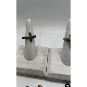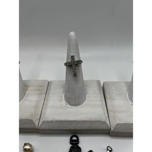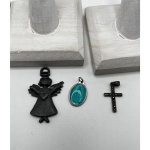 Untested and unmarked religious items (cross, angel, etc). Includes 3 different style cross rings. One is adjustable and the other two are approximately size 5. Also includes 6 pendants/charms (1 is not included in photo). Please inspect images closely. As noted, I don’t know a brand, stone authenticity or metal type.
