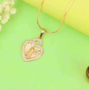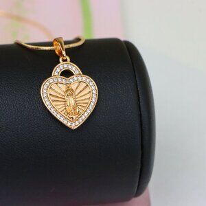 A meaningful pendant featuring a radiant Virgin Mary design in a heart shape, outlined with sparkling crystals for a divine touch.
