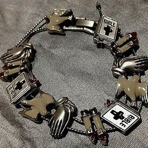 Vintage Slide Bracelet Holy Bible/White Doves/Praying Hands 1980's Finely Detail