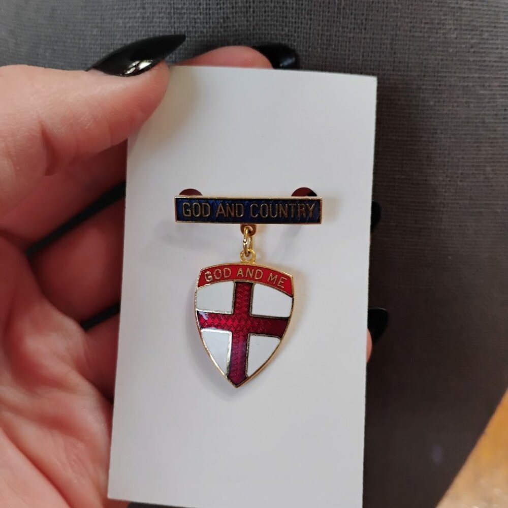 A unique gold toned Religious dangle brooch. "God and Country" above "God and Me". 2 available.