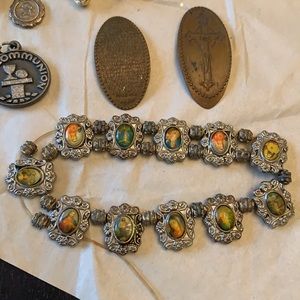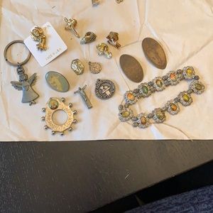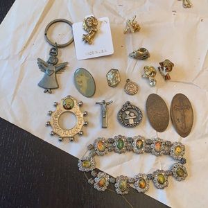 Assorted religious pins, trinkets, tokens, bracelet elastic is broken but could be remade into individual items or restrung. Listed for $8 with $4.99 shipping so i will only make $2.59 on this.