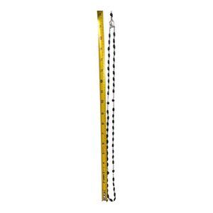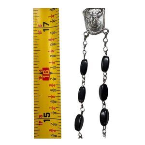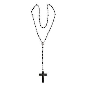 This vintage rosary necklace combines black beads with a silver crucifix and religious medal pendant, offering both elegance and spiritual significance.