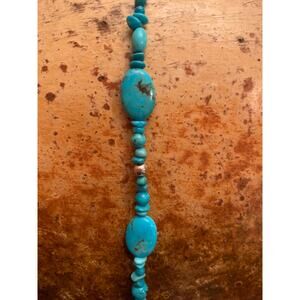 Relios sterling silver and blue turquoise necklace. Differant shapes and sizes of blue turquoise and sterling silver spacer beads. Turquoise shapes include round, chips, barrel, and oval. Sterling silver shapes include round and barrel. Sizes for both are small to medium with the exception of oval shaped flat turquoise which measures .75 inches by .50 inches. Necklace measures 36 inches long. Hallmarked R for Relios and 925.