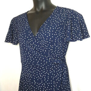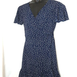 Adorable dress in navy blue with white polka dots and ruffle hem. Ties on the side with ribbon tie inside. v neckline, princess sleeves. Order it today 😊❤️👍. Size M, flowy material, New With Tags, mini/Midi length. Send me an offer 🫴♥️