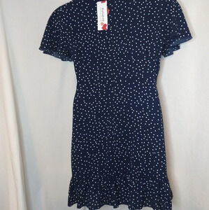 Adorable dress in navy blue with white polka dots and ruffle hem. Ties on the side with ribbon tie inside. v neckline, princess sleeves. Order it today 😊❤️👍. Size M, flowy material, New With Tags, mini/Midi length.