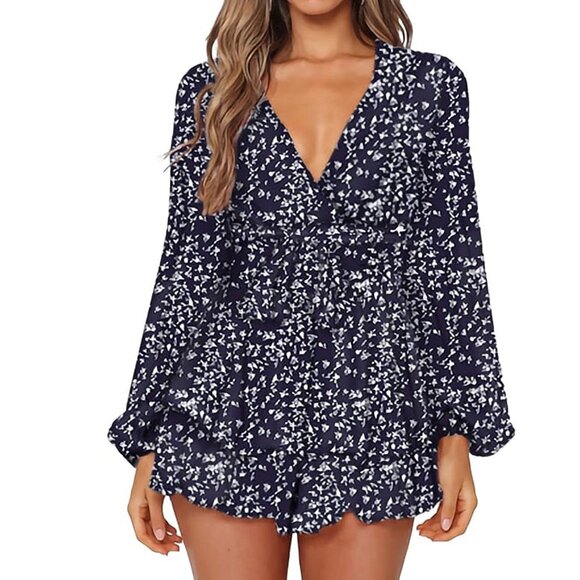 Floral romper, navy blue romper, women’s XL romper, v-neck romper, summer romper, ruffle dress romper, long sleeve playsuit, Relipop romper XL, floral mini romper, vacation outfit