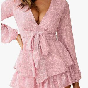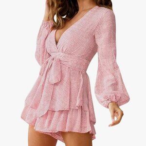 The romper features a flattering deep V-neck, baggy sleeves, a waist tie for a cinched look, and a layered ruffle hem for a playful and feminine touch. It also has a convenient back zipper for easy wear. Made from lightweight, soft, and breathable polyester, it’s comfortable and perfect for warmer weather.